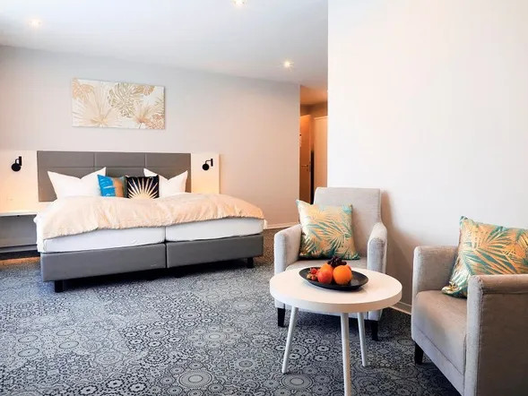 Das familiär geführte Hotel legt großen Wert auf persönliche Betreuung und bietet seinen Gästen 58 komfortable Zimmer, die auf drei Gebäudeteile verteilt sind. Die Zimmer sind modern ausgestattet und verfügen über Dusche/WC, Telefon, Minibar, WLAN und Sat-TV. In einigen Kategorien gibt es zudem Balkone oder Terrassen sowie eine Nespresso-Maschine und direkten SPA-Zugang.