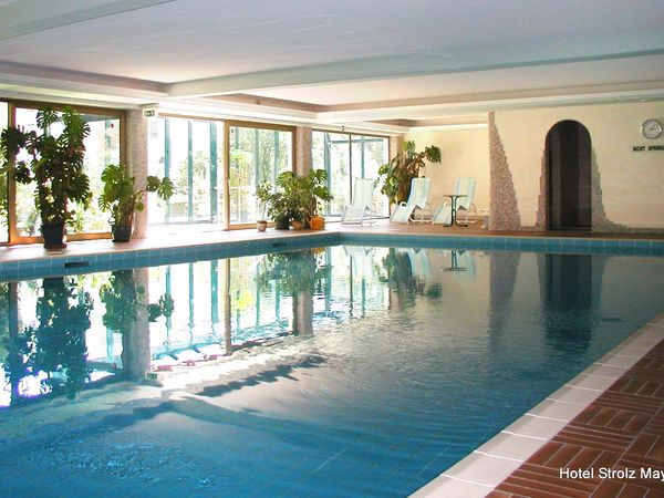 Das Hotel Strolz in Mayrhofen bietet eine gemütliche Atmosphäre im traditionellen Tiroler Stil. Umgeben von Wiesen und Wäldern liegt es ruhig am Ortsrand, nur 300 Meter vom Zentrum entfernt. Die Unterkunft umfasst das Haupthaus sowie zwei Nebenhäuser, die Villa und das Gartenhaus, eingebettet in ein großzügiges Gartenparadies. Gäste können zwischen verschiedenen Zimmerkategorien wählen, darunter Doppelzimmer, Einzelzimmer und Familienapartments, alle ausgestattet mit Bad oder Dusche, WC, Telefon, Kabel-TV und Safe. Ein Highlight ist der Wellnessbereich mit Hallenbad, finnischer Sauna, Dampfbad, Ruheraum und Hydrojet-Massageliege. Im Sommer lädt die sonnige Liegewiese zum Entspannen ein. Kulinarisch werden die Gäste mit einem abwechslungsreichen Frühstücksbuffet und einem 4-Gänge-Wahlmenü am Abend verwöhnt. Das Hotel ist ein idealer Ausgangspunkt für Aktivitäten wie Wandern, Biken und Skifahren im Zillertal. Der Skibus hält nur 80 Meter vom Hotel entfernt und bringt die Gäste direkt zu den Skigebieten Mayrhofen, Ahornbahn und Penkenbahn. Ob Sommer oder Winter, das Hotel Strolz bietet alles für einen erholsamen Urlaub in den Bergen.