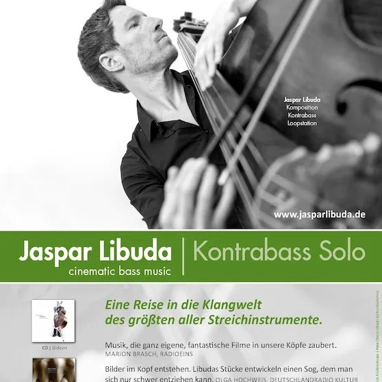 Ihr unternehmt eine Reise in die Klangwelten der größten aller Streichinstrumente. In voller Konzertlänge verwandelt Jaspar Libuda die Kontrabässe in Soloinstrumente mit Klangfarben, die an Celli, Percussions und Gitarren erinnern.